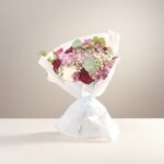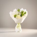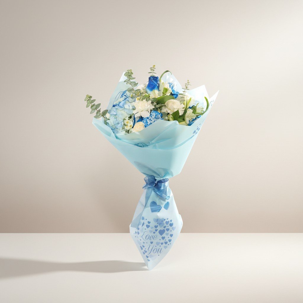 A charming bouquet of white and blue flowers combined with a variety of fresh greenery, beautifully wrapped in soft light blue. This arrangement brings a calm, fresh feeling with a modern and elegant touch, making it perfect for special occasions or as a thoughtful gift that leaves a lasting impression.