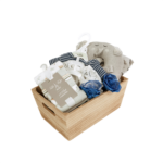 A decorative floral box filled with soft pink baby items for a polished gift look.