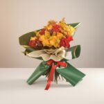 A vibrant bouquet bursting with cheerful yellow blooms, soft pink accents, and fresh greenery, wrapped in elegant olive green paper with a delicate satin ribbon. This bouquet radiates warmth and happiness, perfect for brightening someone’s day or celebrating joyful moments.